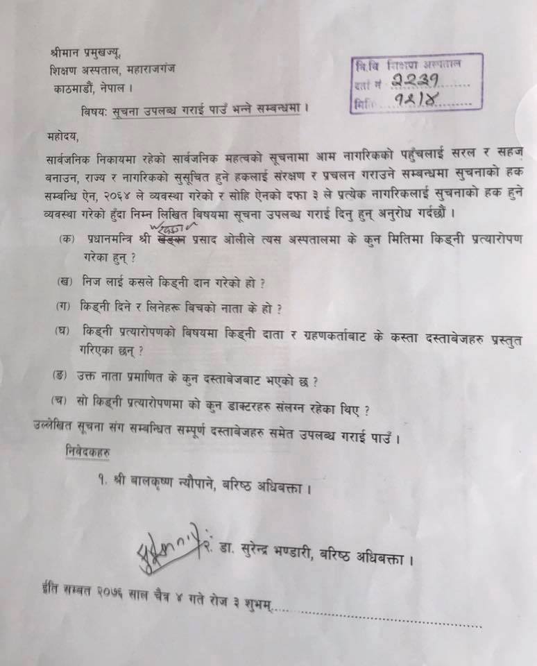 वरिष्ठ अधिवक्ताद्वय बालकृष्ण न्यौपाने र डा सुरेन्द्र भण्डारीले सूचनाको हक सम्बन्धी ऐन २०६४ ले व्यवस्था गरेअनुसार प्रधानमन्त्री ओलीको मिर्गौला प्रत्यारोपणको विषयमा टिचिङ अस्पतालसँग सूचना माग गरेका हुन् ।