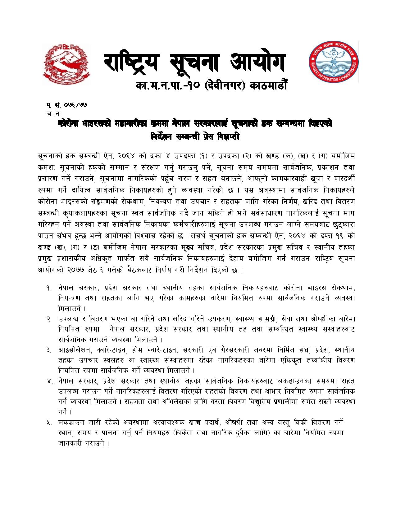 राष्ट्रिय सूचना आयोगद्धारा कोरोना भाइरसको सही सूचना प्रवाह गर्न नेपाल सरकारलाई १६ बुँदे निर्देशन सम्बन्धी प्रेस विज्ञप्ती