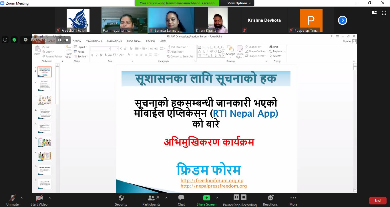 जुम मार्फत संचालन गरिएको उक्त कार्यक्रममा फ्रिडम फोरमकी नायुमैँया खड्काले कार्यक्रम संचालन गर्नुभएको थियो । कार्यक्रममा खड्काले सूचनाको हकका बारेमा छिट्टै बुझ्न प्रयोगमा ल्याएको आरटिआई एपको बारेमा जानकारी गराउँदै यसको व्यवहारीक र सैद्धान्तिक विषयको जानकारी गराउनुभएको थियो ।