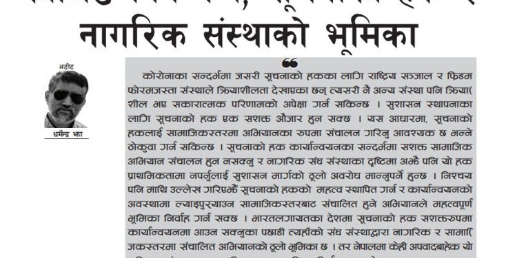त्यस्ता अधिकारप्राप्त निकाय र व्यक्तिलाई अनुसन्धानको दायरामा ल्याई लोकतन्त्र र सुशासन सुनिश्चित गर्ने दिशामा नागरिकस्तरमा दवावको अभियान संचालन गरिनु जरुरी छ । तर दुखको कुरा हामीकहाँ अझै पनि नागरिकस्तरमा यस्तो वातावरणको निर्माण हुन सकेको छैन । सुशासन स्वयंमा एक अभियान हो र यो अभियान राज्यमात्रैका भरमा सफल हुन सम्भव छैन । यसका लागि नागरि कस्तरमा अभियान संचालन हुनु अपेक्षित छ । माथि चर्चा गरिएकोजस्तो नागरिक स्तरका संघ संस्थाह( रुको क्रियाशीलता जरुरी छ । कोरोनाका सन्दर्भमा जसरी सूचनाको हकका लागि राष्ट्रिय सञ्जाल र फ्रिडम फोरमजस्ता संस्थाले क्रियाशीलता देखाएका छन् त्यसरी नै अन्य संस्था पनि क्रियाशील भए सकारात्मक परिणामको अपेक्षा गर्न सकिन्छ । सुशासन स्थापनाका लागि सूचनाको हक एक सशक्त औजार हुन सक्छ । यस आधारमा, सूचनाको हकलाई सामाजिकस्तरमा अभियानका रुपमा संचालन गरिनु आवश्यक छ भन्ने ठोकुवा गर्न सकिन्छ । सूचनाको हक कार्यान्वयनका सन्दर्भमा सशक्त सामाजिक अभियान संचालन हुन नसक्नु र नागरिक संघ संस्थाका दृष्टिमा अझै पनि यो हक प्र( ाथमिकतामा नपर्नुलाई सुशासन मार्गको ठूलो अवरोध मान्नुपर्ने हुन्छ । निश्चय पनि माथि उल्लेख गरिएझैं सूचनाको हकको महत्व स्थापित गर्न र कार्यान्वयनको अवस्थामा ल्याइपुर्याउन सामाजिकस्तरबाट संचालित हुने अभियानले महत्वपूर्ण भूमिका निर्वाह गर्न सक्छ । भारतलगायतका देशमा सूचनाको हक सशक्तरुपमा कार्यान्वयनमा आउन सक्नुका पछाडी त्यहाँको संघ संस्थाद्वारा नागरिक र सामाजिकस्तरमा संचालित अभियानको ठूलो भूमिका छ ।