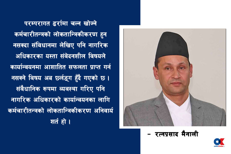 नागरिकलाई कहिल्यै पनि प्रश्न सोध्न सक्ने बन्न नदिने यस्तो प्रवृत्ति राज्यको आधुनिकीकरणका लागि यतिबेला सबैभन्दा घातक बनेर देखापरेको छ । यस्तो प्रवृत्तिका विरुद्ध सचेत र बलियो नागरिक अभियान हामीकहाँ खट्किएको विषय बनेको छ । परम्परागत ढर्रामा चल्न खोज्ने कर्मचारीतन्त्रको लोकतान्त्रिकीकरण हुन नसक्दा संविधानमा लेखिए पनि नागरिक अधिकारका यस्ता संवेदनशील विषयले कार्यान्वयनमा आशातित सफलता प्राप्त गर्न नसक्ने विषय अब छर्लङ्ग हुँदै गएको छ । संवैधानिक रूपमा व्यवस्था गरिए पनि नागरिक अधिकारको कार्यान्वयनका लागि कर्मचारीतन्त्रको लोकतान्त्रिकीकरण अनिवार्य शर्त हो ।