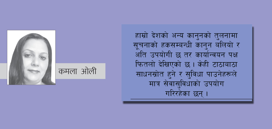 हाम्रो देशको अन्य कानुनको तुलनामा सूचनाको हकसम्बन्धी कानुन बलियो र अति उपयोगी छ तर कार्यान्वयन पक्ष फितलो देखिएको छ । केही टाठाबाठा साधनस्रोत हुने र सुविधा पाउनेहरूले सेवा सुविधाको उपयोग गरिरहेका छन् । मूलभूत रूपमा स्थानीय तह प्रत्यक्ष रूपमा जनताको घरदैलोमा जोडिएको सन्दर्भमा सूचनाको हकको प्रयोग सङ्घीय सरकारको स्तरमा बढी सीमित हुनुले ठूलो पङ्क्ति सूचनाको हकको प्रयोगबाट वञ्चित रहेको पाइन्छ । प्रदेश र स्थानीय तहका सरकारमा सूचनाको हकलाई व्यावहारिक जीवनमा कार्यान्वयन गर्न व्यवस्थित कार्ययोजनाको आवश्यकता छ ।