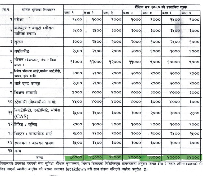 यस्तै मासिक शिक्षण शुल्क ५ हजार लिएको दावी गर्ने यूलेन्स स्कुलले अन्य विभिन्न १४ वटा उपशिर्षकमा झण्डै १० गुना बढि रकम असुल गर्दै आएको छ मासिक शुल्कमा लिने उपशिर्षक र वार्षिक शुल्कमा लिने उपशिर्षक मिल्दाजुल्दा रहेका छन् । मासिक शिक्षण शुल्क रु ५ हजार, परीक्षा १ हजार ५ सय, कम्प्युटर र आइटी ३ हजार ५ सय, सुक्षा ३ हजार, अपकिपिङ २ हजार ५ सय, भोजन १३ हजार, आर्ट एण्ड क्राफ्ट २ हजार ५ सय, विशेष प्रशिक्षण ३ हजार शिक्षण सामाग्री स्टेशनरी ४ हजार ५ सय, क्रियटिमिटी एक्टिभिटी ३ हजार ५ सय, हिटट कुलिङ २ हजार थिएटर पर्फमिङ आर्ट २ हजार ५ सय स्थल गत र अध्ययन भ्रमण ३ हजार ५ सय समेत गरि १ कक्षा पढ्ने विद्यार्थीले महिनाको ५५ हजार रुपैयाँ स्कुललाई बुझाउनुपर्छ । २ कक्षामा ५० हजार, ३ कक्षामा ४६ हजार, ४ कक्षामा ४५ हजार, ५ कक्षामा ३८ हजार, ६ कक्षामा ४५ हजार, ७ कक्षामा ३९ हजार, ८ कक्षामा ३५ हजार, ९ कक्षामा ४२ हजार र १० कक्षामा ३७ हजार रुपैयाँ विद्यालय बुझाउन पर्ने हुन्छ । समग्रमा एउटा कक्षामा पढ्ने विद्यार्थीले एक वर्षमा ७ लाख रुपैयाँ भन्दा बढि बुझाउनु पर्ने हामीलाई प्राप्त डकुमेन्टबाट पुष्टि हुन आएको छ ।