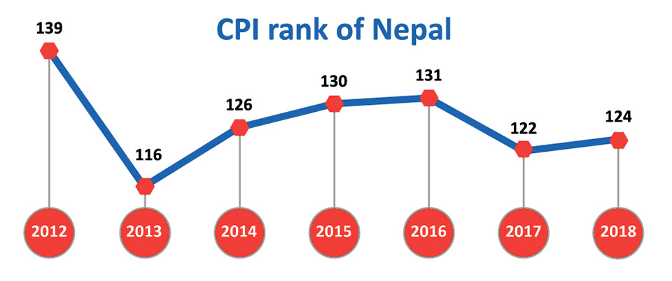 The annual survey released by the Berlin-based corruption watchdog has placed Nepal in 124th position with a score of 31, among the 180 countries surveyed. Nepal was in 122th position last year although its score was the same.