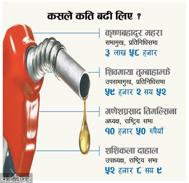 प्रतिनिधिसभाको प्रतिपक्षी दल कांग्रेसका प्रमुख सचेतक बालकृष्ण खाँण, सत्तापक्षका प्रमुख सचेतक देव गुरुङ र संसदीय समितिका सभापतिहरू, राष्ट्रिय सभा प्रतिपक्षी दलका प्रमुख सचेतकले मासिक २ सय लिटर इन्धन (२२ हजार रुपैयाँ) लिने गरेका छन् । सत्तापक्षकी सचेतक शान्ता चौधरी, विपक्षी दलकी सचेतक पुष्पा भुसाल र फोरमका उमाशंकर अरगरियाले १ सय ५० लिटर इन्धन (१६ हजार ६ सय रुपैयाँ) पाउँछन् ।