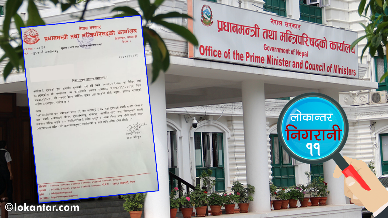 सरकारी कार्यालयमा हुने सवारीसाधनको दुरुपयोगबारे लोकान्तर डटकमले शृंखलाबद्ध रुपमा समाचार प्रकाशन गर्दै आइरहेको छ । उपराष्ट्रपतिको कार्यालय, रक्षा मन्त्रालय लगायत अधिकांश सरकारी निकायले सूचना दिएपनि प्रधानमन्त्री कार्यालयले भने सूचना दिन कन्जुस्याइँ गरेको छ ।