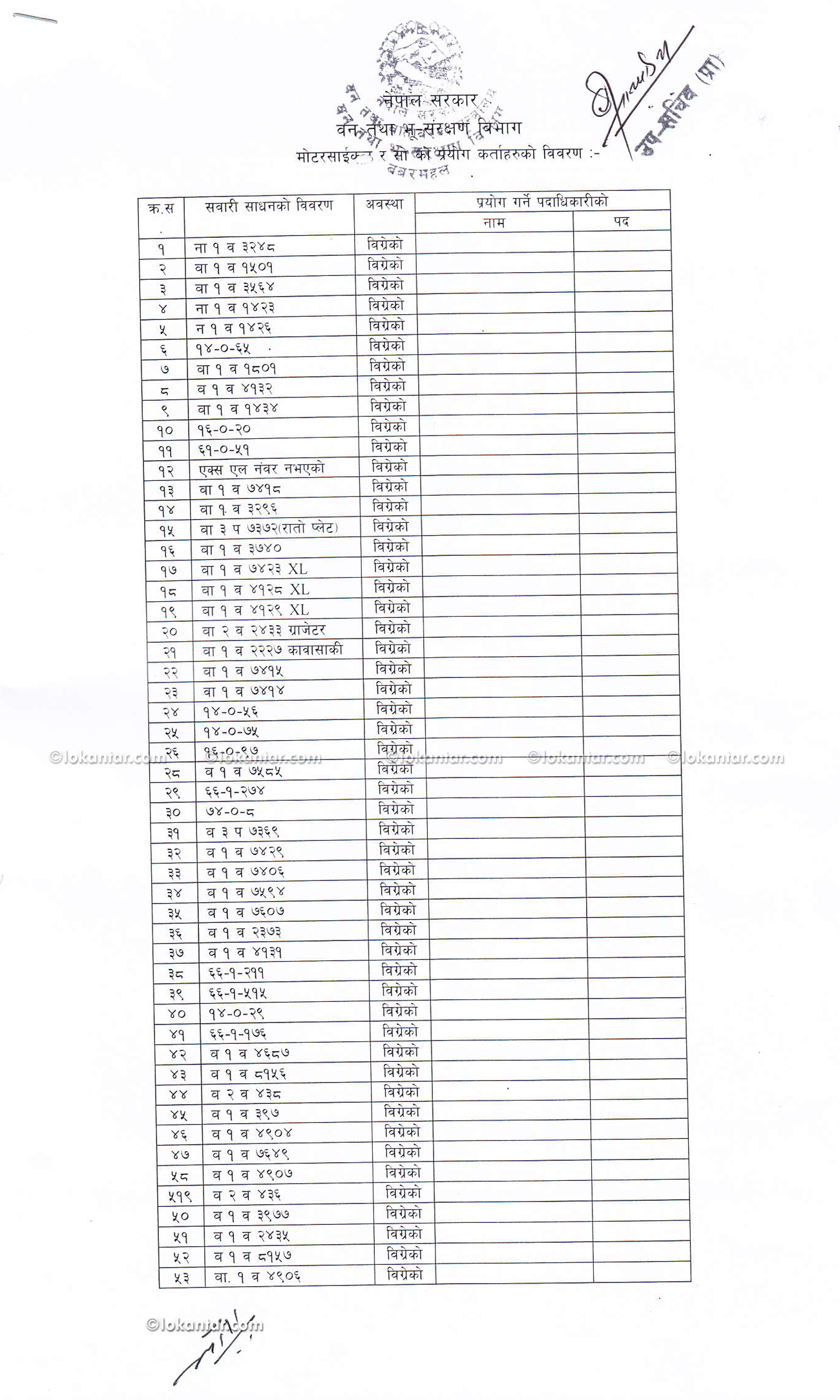 विभागले उपलब्ध गराएको विवरणमा ३३ वटा गाडीमध्ये १३ वटा मात्र चालु अवस्थामा रहेको उल्लेख छ । यस्तै १ सय १ मोटरसाइकल तथा स्कूटरमध्ये ४१ वटा मात्र चालु अवस्थामा रहेको देखिन्छ ।