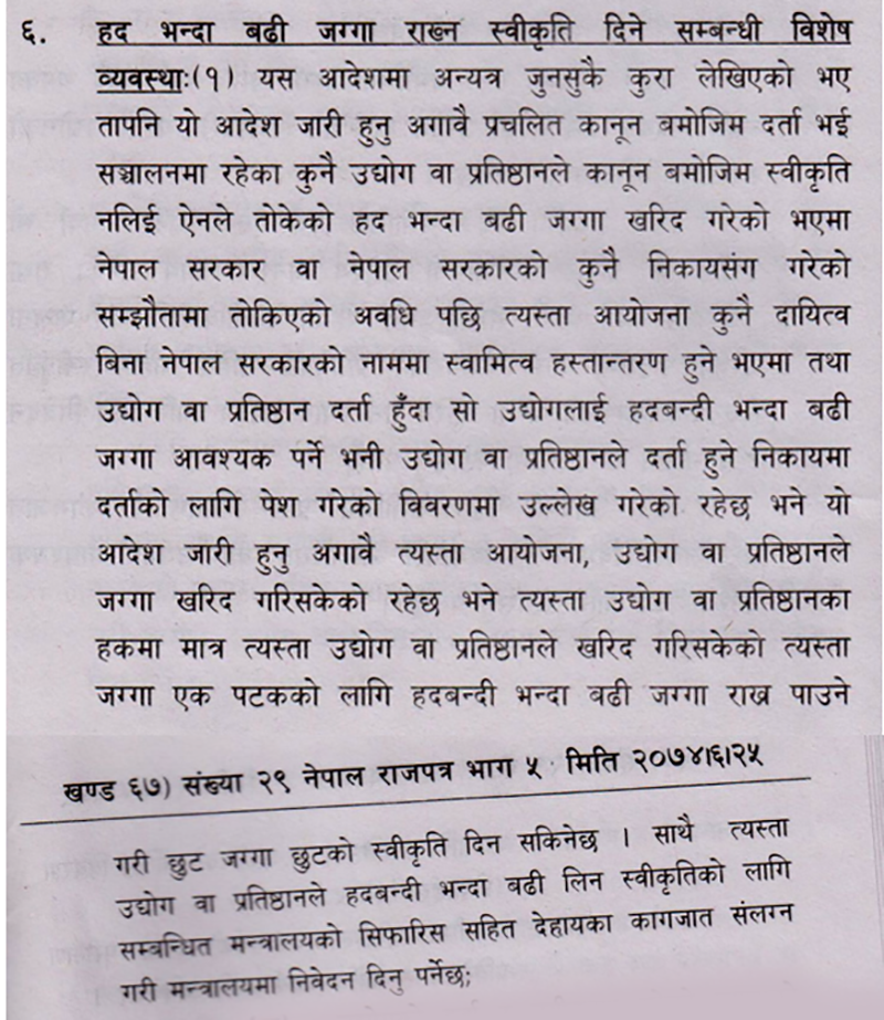 (१) यस आदेशमा अन्यत्र जुनसुकै कुरा लेखिएको भए तापनि यो आदेश जारी हुनुअगावै प्रचलित कानून बमोजिम दर्ता भई सञ्चालनमा रहेका कुनै उद्योग वा प्रतिष्ठानले कानून बमोजिम स्वीकृति नलिई ऐनले तोकेको हदभन्दा बढी जग्गा खरिद गरेको भएमा नेपाल सरकार वा नेपाल सरकारको कुनै निकायसँग गरेको सम्झौतामा तोकिएको अवधिपछि त्यस्ता आयोजना कुनै दायित्व विना नेपाल सरकारको नाममा स्वामित्व हस्तान्तरण हुने भएमा तथा उद्योग वा प्रतिष्ठान दर्ता हुँदा सो उद्योगलाई हदबन्दी भन्दा बढी जग्गा आवश्यक पर्ने भनी उद्योग वा प्रतिष्ठानले दर्ता हुने निकायमा दर्ताका लागि पेश गरेको विवरणमा उल्लेख गरेको रहेछ भने यो आदेश जारी हुनुअगावै त्यस्ता आयोजना, उद्योग वा प्रतिष्ठानले जग्गा खरिद गरिसकेको रहेछ भने त्यस्ता उद्योग वा प्रतिष्ठानका हकमा मात्र त्यस्ता उद्योग वा प्रतिष्ठानले खरिद गरिसकेको त्यस्ता जग्गा एक पटकको लागि हदबन्दी भन्दा बढी जग्गा राख्न पाउने गरी छूट जग्गा छूटको स्वीकृति दिन सकिनेछ । साथै त्यस्ता उद्योग वा प्रतिष्ठानले हदबन्दी भन्दा बढी लिन स्वीकृतिको लागि सम्बन्धित मन्त्रालयको सिफारिस सहित देहायका काजात संलग्न गरी मन्त्रालयमा निवेदन दिनुपर्ने छ ।’