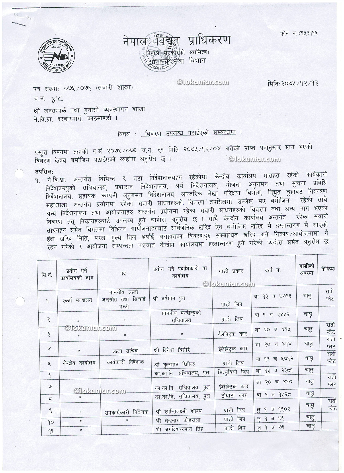 प्राधिकरणले उपनिर्देशक कृष्णबहादुर खड्का, रुक्मिणी घिमिरे, डोलनाथ कंडेल र गोकुलराज खत्रीलाई पनि प्राधिकरणले चारपांग्रे सवारी सुविधा उपलब्ध गराएको देखिन्छ ।