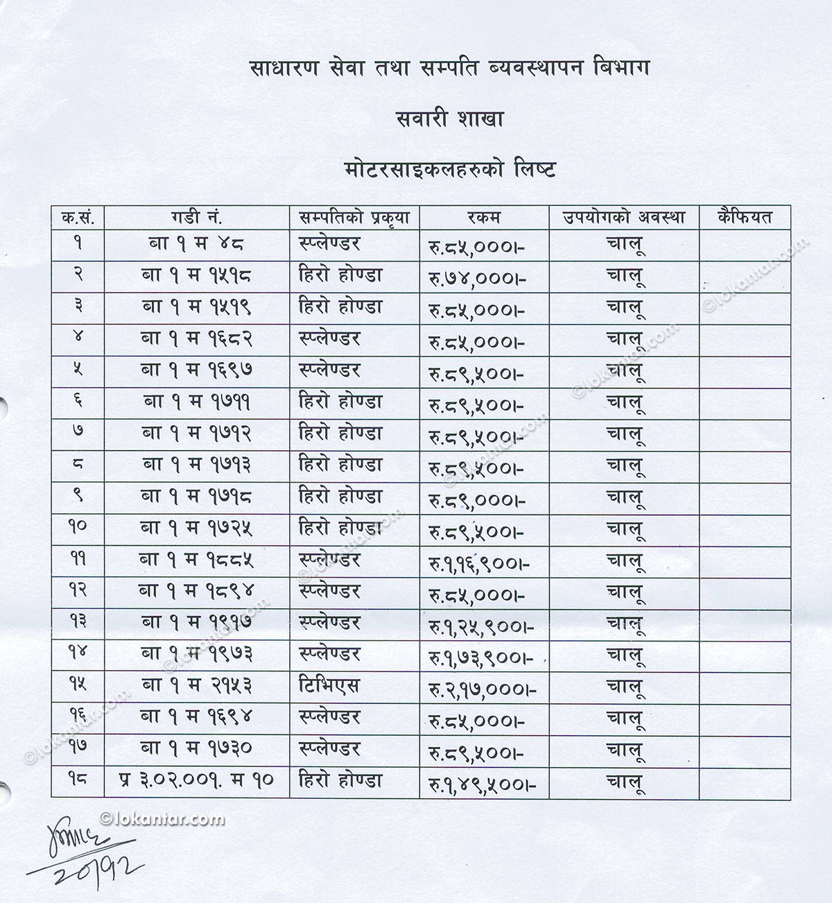 निगमले लोकान्तर डटकमलाई उपलब्ध गराएको विवरणमा एउटै नम्बरका २ गाडी देखिएको छ । अध्यक्ष खरेलले चढ्ने बा १ ञ २४४८ नम्बरको एसयुभी जीप र कारको नम्बर एउटै छ । (हेर्नुहोस सूचीको क्रम संख्या १ र ४५) दुईवटै गाडीको एउटै मूल्य छ ।