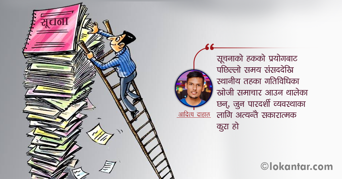 सूचनाको हकको प्रयोगबाट पछिल्लो समय संसददेखि स्थानीय तहका गतिविधिको समेत खोजी समाचार आउन थालेका छन्, जुन पारदर्शी व्यवस्थाका लागि अत्यन्तै सकारात्मक हो । यसरी सूचना माग्ने र समाचार सम्प्रेषण गर्नाले भर्खरै स्थानीय सरकारको अभ्यासमा लागेका जनप्रतिनिधि तथा कर्मचारीलाई पारदर्शी बनाएर विश्वासिलो बन्न सहयोग पुग्छ । यसरी समाचारको माध्यमबाट प्रकाशित हुने खोजी समाचारले पक्कै देश विकासमा पनि टेवा पुग्छ ।
