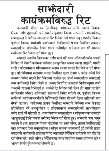 सांसदले स्थानीय विकासका लागि खर्च गर्नेे रकम संविधानविपरीत भएको जिकिर गर्दै नेपाली कांग्रेसका तर्फबाट समानुपातिक सांसद प्रकाश रसाइली, रंगमति शाही र राष्ट्रियसभाका राष्ट्रियसभाका सदस्य प्रकाश पन्थले रिट निवेदन दर्ता गरेका हुन्। प्रतिनिधिसभा सदस्यमा प्रत्यक्ष निर्वाचित एउटा क्षेत्रमा ६ करोड रुपैयाँ दिने व्यवस्था विभेद भएको रिट निवेदनमा उल्लेख छ।