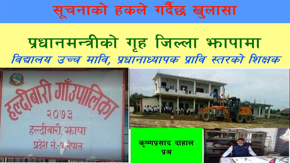 झापा, ०२ मंसीर। गत वर्षदेखि कोभिड १९ ले विद्यालय शिक्षामा पारेको असर र पछिल्लो समय विद्यालय शिक्षाको गुणस्तरमा देशव्यापी रुपमा बहस भइरहँदा प्रधानमन्त्री केपी शर्मा ओलीको गृह जिल्ला झापाको एक विद्यालयमा चरम राजनीतिक गतिविधिका कारण प्रावि स्तरको शिक्षकले उच्च माध्यमिक तहसम्मको प्रधानाध्यापक पद पाएको भेटिएको छ । सूचनाको हकका अभियन्ता इश्वरा तिवारीले सूचनाको हकको प्रयोग गरी स्थानीय स्तरबाट विद्यालयमा माग गर्नुभएको लिखित सूचनामा विद्यालयले उपलब्ध गराएको विवरणले यो खुलासा गरेको हो ।
