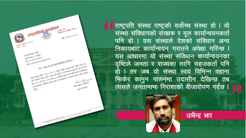 सन्दर्भ राष्ट्रपति कार्यालयको हो । राष्ट्रपति कार्यालयलाई सरकारभन्दा भिन्न राखेर हेर्न सकिँदैन । नेपालजस्तो आलंकारिक राष्ट्रपति भएको देशमा त्यस कार्यालयबाट भए गरेका कार्यको जिम्मेबारी सरकारले नै लिनुपर्ने हुन्छ । यस आधारमा राष्ट्रपति कार्यालयबाट कुनै त्रुटी हुन्छ भने त्यो सरकार अर्थात् कार्यकारीकै जिम्मामा जान्छ ।