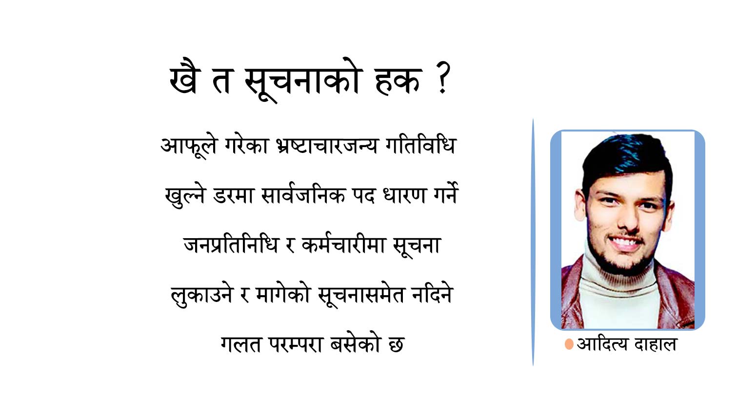 सूचनाको हकसम्बन्धी कानुन निर्माण भएको १४ वर्ष भइसक्यो । यो हक कार्यान्वयनमा आएको यतिका समय बितिसक्दा पनि यसको प्रयोग भने सन्तोषजनक हुन सकेको छैन । देश संघीय संरचनामा गइसकेपछि संघ, प्रदेश र स्थनीय गरी अहिले तीन तहका सरकार छन् । यी सरकार र सार्वजनिक निकाय कति पारदर्शी छन् ? जनताप्रति कति उत्तरदायी छन् ? यी निकायको कामकारबाही कसरी भइरहेको छ ? भ्रष्टाचारजन्य गतिविधि भएको छ वा छैन भनी सूचना माग्नु र खोज्नु नागरिकको अधिकार हो । सार्वजनिक निकायमा हुने गरेका आर्थिक, प्रशासनिक तथा विभिन्न विकास बजेटको प्रयोगबारे सूचना माग गर्दा सूचना पाउनै मुस्किल पर्छ । सूचना अधिकारी र सार्वजनिक पदधारण गर्ने व्यक्ति यस हकको बाधकका रूपमा स्थापित हुने गरेका छन् । सार्वजनिक निकायले ऐनअनुसार स्वतः सार्वजनिक गर्नुपर्ने सूचना सार्वजनिक गर्नु त परैको कुरा, नागरिकले मागेका सूचनामा समेत अवरोध गर्ने गरेका छन् ।