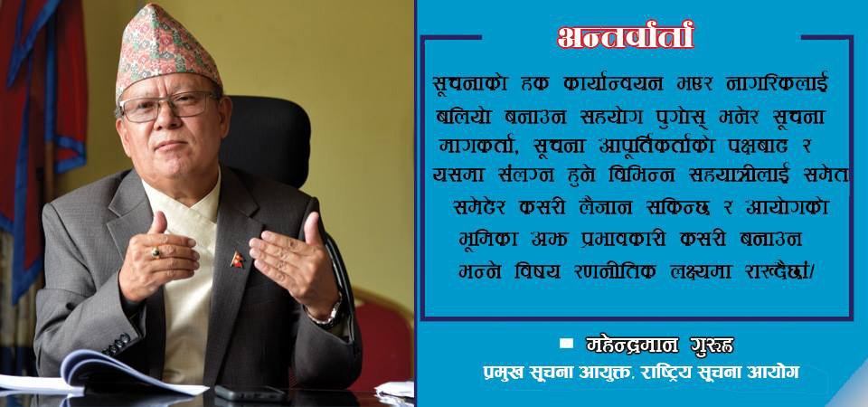 नेपालमा सूचनाको हकसम्बन्धी संवैधानिक व्यवस्थाको प्रारम्भ २०४७ सालको संविधानबाट भएको हो । ‘प्रत्येक नेपालीले सार्वजनिक महत्त्वका कुनै पनि विषयको सूचना माग्ने र पाउने अधिकार हुनेछ’ भन्ने व्यवस्था २०४७ को संविधानको धारा १६ मा गरिएको थियो । त्यस्तै, २०६३ सालको अन्तरिम संविधानको धारा २७ मा समेत‘प्रत्येक नेपाली नागरिकलाई आफ्नो वा सार्वजनिक सरोकारको कुनै पनि विषयको सूचना माग्ने र पाउने हक हुनेछ’ भनिएको छ । यससँगै ‘तर कानुनद्वारा गोप्य राख्नुपर्ने सूचनाको जानकारी दिन कसैलाई बाध्य पारिने छैन’ भन्ने व्यवस्थासमेत गरियो । सोहीअनुसार, सूचनाको हकसम्बन्धी अधिकारलाई कार्यान्वयन गर्न सूचनाको हकसम्बन्धी ऐन, २०६४ साउन २ गते व्यवस्थापिका संसद्बाट पारित भई सभामुखबाट साउन ५ गते प्रमाणीकरण भएको थियो । उक्त ऐनको दफा १ को उपदफा (२) मा प्रस्तुत ऐन प्रमाणीकरण भएको ३० औँ दिनबाट लागू हुन्छ भन्ने प्रावधानबमोजिम २०६४ भदौ ३ गतेबाट नेपालमा सूचनाको हकसम्बन्धी ऐन लागू भएको दिनलाई ‘राष्ट्रिय सूचना दिवस’का रूपमा समेत मनाइँदै आएको छ । प्रस्तुत छ, सोही सन्दर्भमा सूचनाको हकको कार्यान्वयन, त्यसक्रममा देखिएका समस्या र समाधानका लागि आयोगको कार्ययोजनाका सम्बन्धमा गोरखापत्रकादीपक श्रेष्ठले गर्नुभएको कुराकानी :