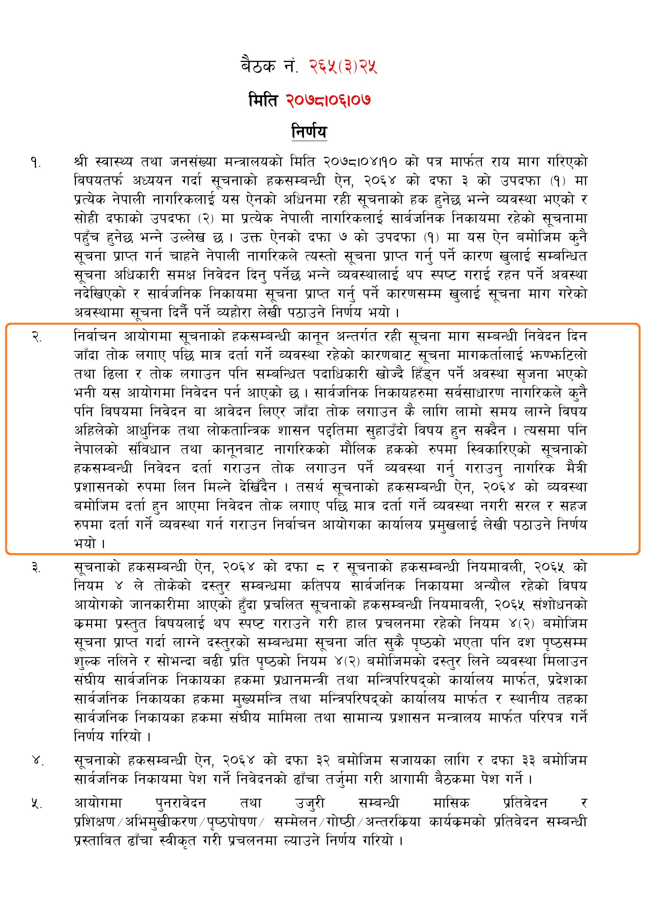 निर्वाचन आयोग नेपाल लगायत विभिन्न सार्वजनिक निकायले सूचना माग गर्ने नागरिकलाई सोही कार्यालयको कर्मचारीले तोक लगाएपछि मात्रै निवेदन दर्ता गर्ने प्रक्रिया हटाउन आयोगको असोज ७ गते बसेको बैठक नं. २६५ (३) २५ ले निर्णय गरेको हो ।