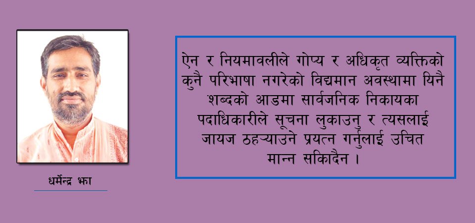 ऐन र नियमावलीले गोप्य र अधिकृत व्यक्तिको कुनै परिभाषा नगरेको विद्यमान अवस्थामा यिनै शब्दको आडमा सार्वजनिक निकायका पदाधिकारीले सूचना लुकाउनु र त्यसलाई जायज ठह¥याउने प्रयत्न गर्नुलाई उचित मान्न सकिँदैन । निजामती सेवा ऐन, २०४९ र नियमावली २०५० एक किसिमले निजामती सेवा ऐन २०१३ को निरन्तरता हो र हालको ऐन र नियमावलीमा उल्लेख गरिएको गोपनीयतासम्बन्धी व्यवस्था पनि पुरानै ऐनको व्यवस्था निरन्तरता हो । यसको अर्थ हो भौतिक रूपमा नेपाली कर्मचारीतन्त्र आधुनिक भए पनि यो पुरानै परम्परावादी मानसिकताबाट निर्देशित छ । नेपाली कर्मचारीतन्त्र आजको २१औँ शताब्दी, जहाँ शासन खुला र पारदर्शी हुनुपर्ने कल्पना गरिन्छ, मा पनि गोपनीयता र अपारदर्शीपनलाई महìव दिन्छ ।
