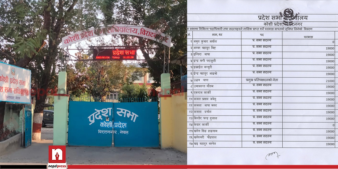 कोसी प्रदेश सभा सचिवालयले प्रदेश सभा सदस्यहरूका लागि घर भाडा भनेर १४ लाख ६५ हजार रुपैयाँ निकासा गर्दै आएको छ ।