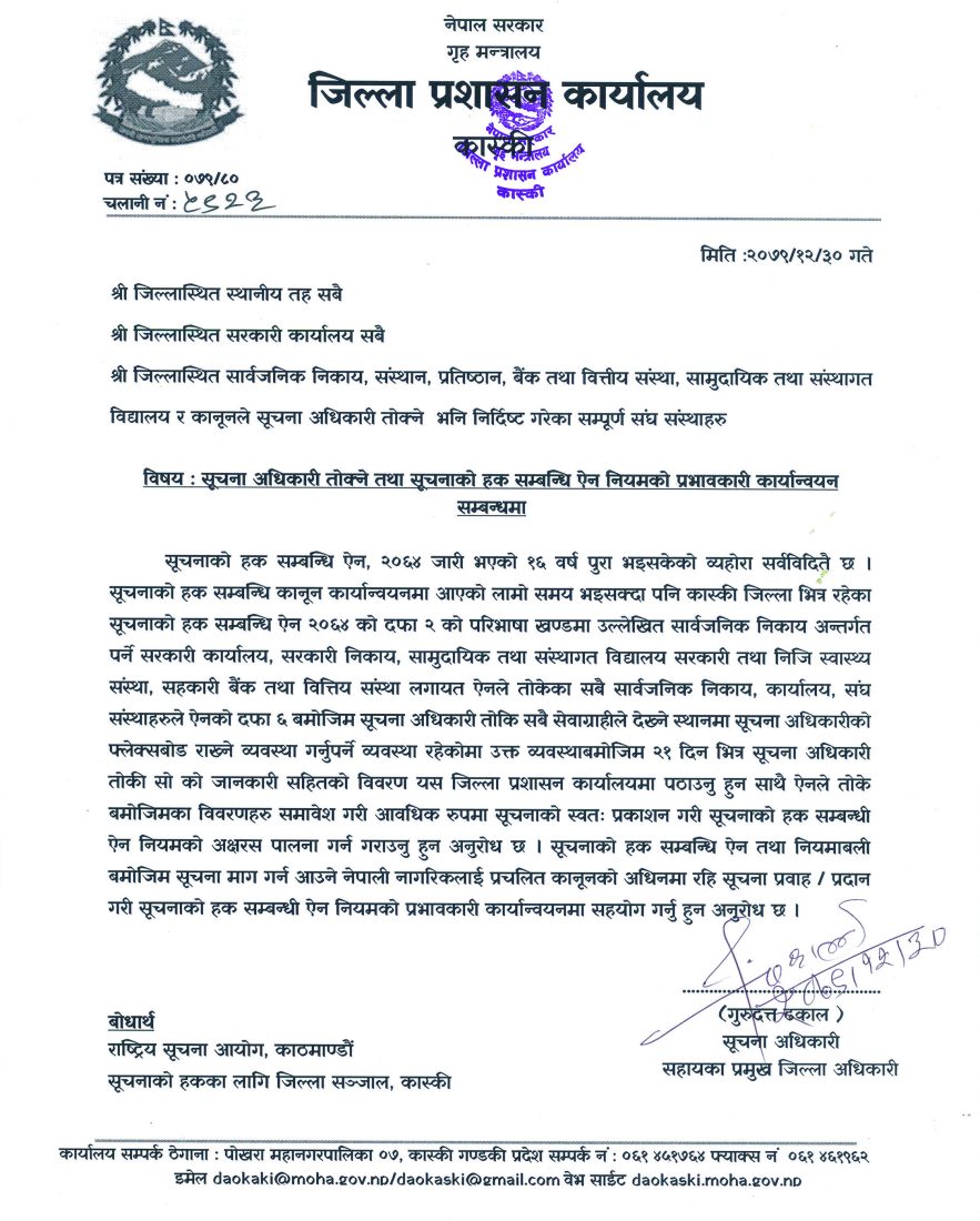 सूचनाको हक सम्बन्धी ऐन २०६४ लाई कार्यान्वयन गराउन कास्कीका प्रमुख जिल्ला अधिकारी ले निर्देशन जारी गरेका छन् । मिति २०७९ चैत्र ३० गते जारी पत्रका जिल्ला भित्रका सम्पूर्ण स्थानीय तह, जिल्ला स्थित सरकारी कार्यालय सवै कास्की जिल्ला भित्र रहेका संस्थान प्रतिष्ठान वैंक तथा वित्तीय संस्था, सामुदायिक विद्यालय तथा संस्थागत विद्यालय लगायत सूचनाको हक समबन्धी ऐन २०६४ को दफा २ ले परिभाषा गरेका सम्पूर्ण सार्वजनिक निकायहरुलाई ऐनको दफा ६ बमोजिम सूचना अधिकारी तोक्न, सवै सेवाग्राहीले देख्ने स्थानमा सूचना अधिकारीको फ्लेक्स बोर्ड राख्न र ऐनले तोके बमोजिमको विवरण स्वतः प्रकाशन गरी सूचनाको हक सम्बन्धी ऐन नियमको अक्षरस पालना गर्न अनुरोध गरिएको छ। सवै सार्वजनिक निकायहरुले सूचनाको हक सम्बन्धी कानून बमोजिम सूचना अधिकारी तोकी २१ दिन भित्र जिल्ला प्रशासन कार्यालयलाई जानकारी सहितको विवरण उपलब्ध गराउन सूचना अधिकारी ९सहायक प्र.जि.अ. गुरुदत्त ढकालद्धारा हस्ताक्षरित पत्रमा जनाइएको छ ।