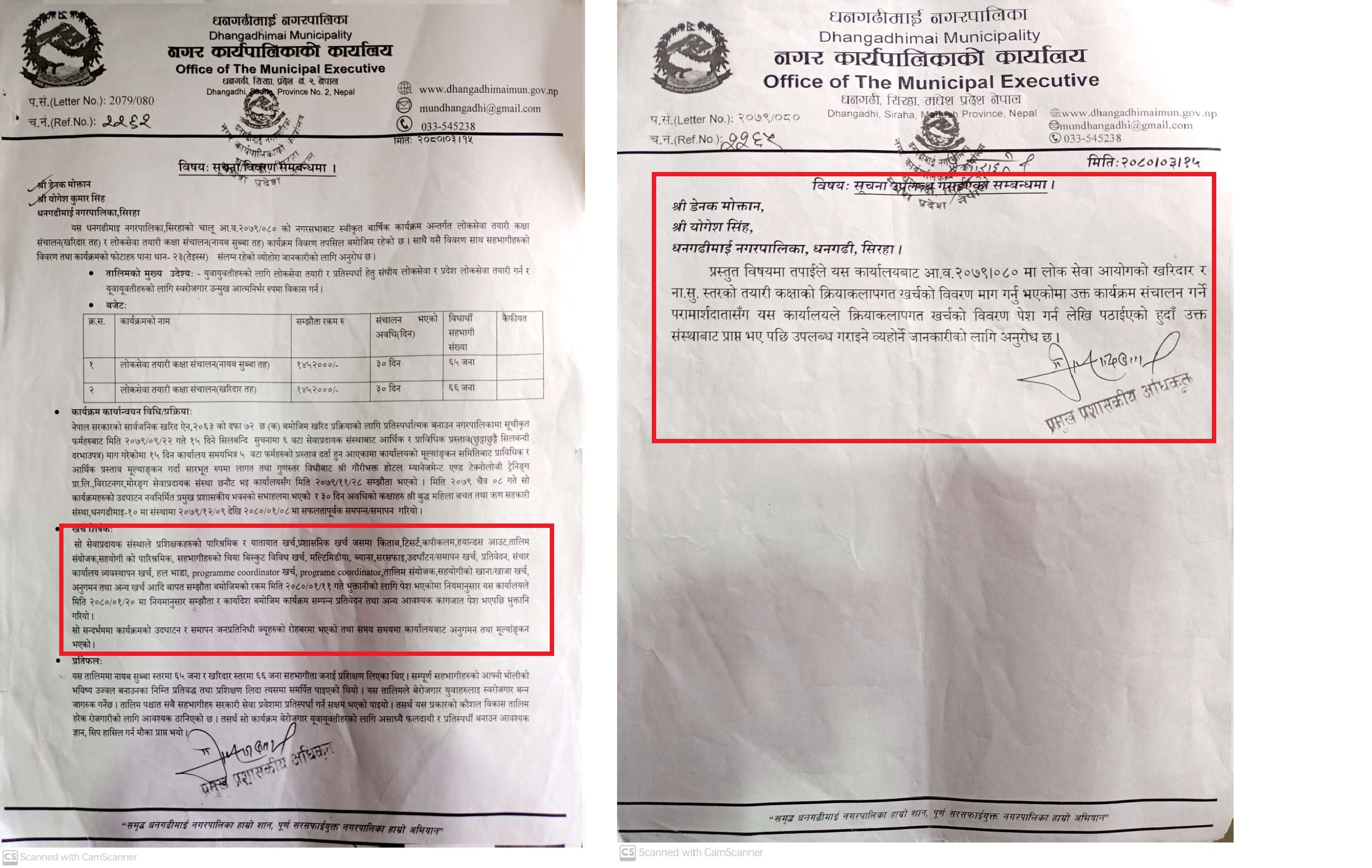 संस्थाले प्र्रशिक्षकहरुको पारिश्रमिक र यातायात खर्च, प्रशासनिक खर्च जसमा किताव, टिसर्ट, कपी कलपम, ह्यान्डस आउट, तालिम संयोजक, सहसंयोजकको पारिश्रमिक, सहाभागीहरुको चिया विस्कुट विविध खर्च, मल्टिमिडिया, व्यानर, सरसफाई, उदघाटन/समापन, प्रदिवेदन, संचार, कार्यालय व्यवस्थापन खर्च, हलभाडा, अनुागमन तथा अन्य सम्झौता बमोजिमको रकम गत बैशाख ११ गते भुक्तानीको लागि नियमानुसार सम्झौता र कार्यादेश बमोजिम कार्यक्रम सम्पन्न प्रतिवेदन तथा अन्य आवश्यक कागजात पेश गरेपछि गत बैशाख २० गते भुक्तानी गरियो भन्ने उल्लेख गरेको छ।