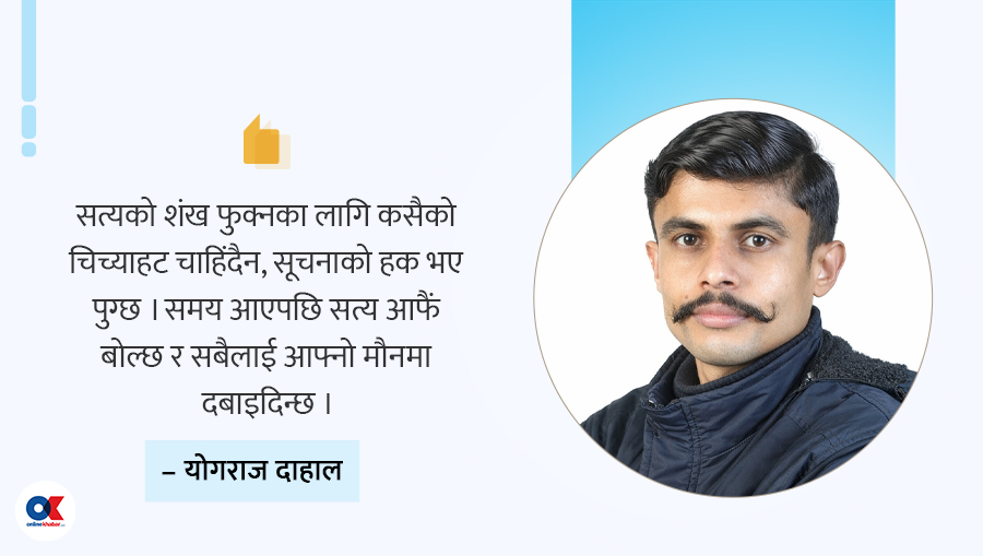 सत्यको शंख फुक्नका लागि कसैको चिच्याहट चाहिंदैन, सूचनाको हक भए पुग्छ । समय आएपछि सत्य आफैं बोल्छ र सबैलाई आफ्नो मौनमा दबाइदिन्छ । हाम्रो काम भनेको बस् चुपचाप बस्नु र त्यो क्षणको प्रतीक्षा गर्नु हो किनकि त्यो क्षण आएपछि, बोल्नेलाई बोल्ने ठाउँ नै हुँदैन भने जस्तै भयो भन्ने कुरा प्रमाणित भयो ।